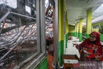 Guru melihat kondisi ruang kelas yang atapnya ambruk di SMAN 1 Ciampea, Kabupaten Bogor, Jawa Barat, Jumat (15/3/2024). Menurut data BPBD Kabupaten Bogor ambruknya atap bangunan SMAN 1 Ciampea dipicu hujan deras yang mengguyur wilayah tersebut pada Kamis (14/3), dan mengakibatkan tujuh orang siswa terluka. ANTARA FOTO/Yulius Satria Wijaya/nym.