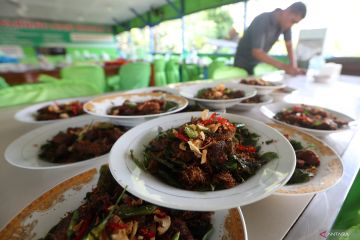 Pekerja menyiapkan berbagai menu makanan tradisional khas Aceh untuk berbuka puasa pada Ramadhan 1445 H di Warung Nasi Hasan 3 Pango Raya, Banda Aceh, Aceh, Sabtu (16/3/2024). Restoran atau warung makan yang menyediakan menu makanan tradisional Aceh tersebut sejak hari kedua Ramadhan mulai ramai dipadati warga untuk buka puasa bersama keluarga dan kerabat. ANTARA FOTO/Irwansyah Putra/aww.