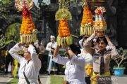 Umat Hindu membawa gebogan atau sesaji berisi hiasan janur dalam rangkaian pelaksanaan upacara Piodalan dan Pewintenan pemangku di Pura Agung Girinatha, Semarang, Jawa Tengah, Minggu (24/3/2024). Upacara Piodalan sekaligus Pewintenan pemangku dengan menampilkan sejumlah kesenian tari pura yang diikuti ratusan umat Hindu di Kota Semarang serta beberapa pemangku dari kabupaten/kota se-Jawa Tengah tersebut bermakna menyucikan kembali pura serta sebagai rasa syukur atas hari jadi Pura Agung Giri Natha. ANTARA FOTO/Makna Zaezar/nym.