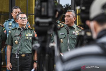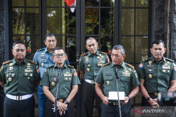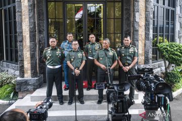 Kapuspen TNI Mayjen TNI Nugraha Gumilar (ketiga kiri), Pangdam XVII/Cenderawasih Mayjen TNI Izak Pangemanan (kedua kanan) bersama perwira tinggi TNI memberikan keterangan pers terkait video penyiksaan yang dilakukan oknum prajurit TNI Yonif 300 Raider/Bjw terhadap terduga anggota KKB Papua Definus Kogoya di Subden Denma Mabes TNI, Jakarta, Senin (25/3/2024). Dalam keterangannya TNI AD tidak membenarkan aksi kekerasan yang dilakukan oleh prajurit TNI tersebut serta meminta maaf kepada seluruh masyarakat Indonesia khususnya Papua atas ketidaknyamanan karena video kekerasan itu. ANTARA FOTO/Muhammad Adimaja/aww.