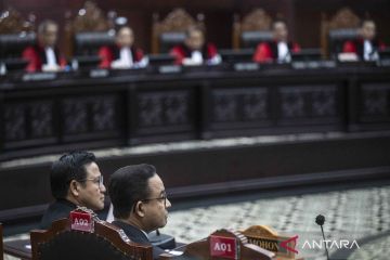 Calon presiden dan calon wakil presiden nomor urut 1 Anies Baswedan (kanan) dan Muhaimin Iskandar (kiri) selaku pihak pemohon mengikuti sidang perdana perselisihan hasil Pilpres 2024 di Gedung Mahkamah Konstitusi, Jakarta, Rabu (27/3/2024). Sidang tersebut beragenda pemeriksaan pendahuluan dengan penyampaian permohonan dari pemohon. ANTARA FOTO/Aprillio Akbar/nym.