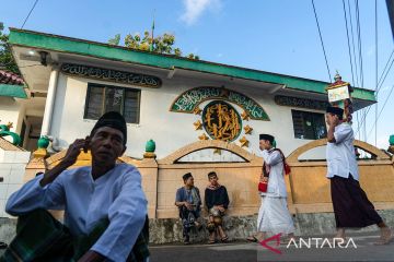Umat muslim jamaah Masjid Aolia bersiap untuk melaksanakan ibadah Shalat Idul Fitri di Giriharjo, Panggang, Gunung Kidul, D.I Yogyakarta, Jumat (5/4/2024). Jamaah Masjid Aolia menetapkan jatuhnya 1 Syawal 1445 H pada Jumat (5/4/2024) didasari petunjuk dari pimpinan jamaah Masjid Aolia, KH Raden Ibnu Hajar Sholeh atau yang biasa dikenal dengan nama Mbah Benu. ANTARA FOTO/Andreas Fitri Atmoko/rwa.