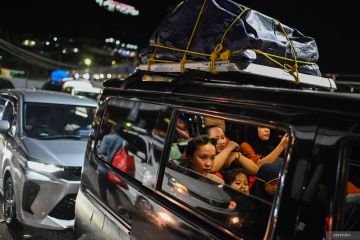 Pemudik menunggu antrean masuk ke Pelabuhan Merak, Cilegon, Banten, Sabtu (6/4/2024). Sebanyak 222 ribu orang dan 46.250 kendaraan roda empat diseberangkan dari Pelabuhan Merak, Banten menuju ke Pelabuhan Bakauheni, Lampung menggunakan sarana transportasi laut PT ASDP Indonesia Ferry (Persero) pada 3 - 5 April 2024. ANTARA FOTO/ Rivan Awal Lingga/foc.