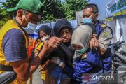 Petugas membantu pemudik yang kelelahan di Pelabuhan Ciwandan, Cilegon, Banten, Minggu (7/4/2024). Sejumlah pemudik yang hendak masuk pelabuhan tersebut mengalami kelelahan dan ada yang pingsan akibat menunggu waktu antrean yang lama dan disertai cuaca panas. ANTARA FOTO/Muhammad Bagus Khoirunas/pras.
