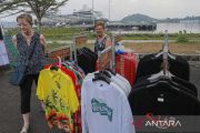 Sejumlah wisatawan mancanegara penumpang kapal pesiar MS Azamara Onward melihat suvenir yang dijual pelaku usaha kreatif di Dermaga CT-3 BPKS, Kota Sabang, Aceh, Selasa (9/4/2024). Kapal pesiar MS Azamara Onward mengangkut sebanyak 511 wisatawan dari berbagai negara untuk melakukan tur wisata ke Pulau Weh Sabang dengan mengunjungi sejumlah destinasi wisata jelang Lebaran Idul Fitri 1445 H, dan kunjungan ini diharapkan berdampak pada pertumbuhan ekonomi warga. ANTARA FOTO/Khalis Surry/pras.