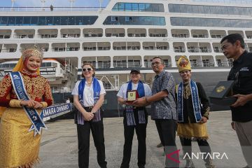 Kapal pesiar MS Azamara Onward yang membawa wisatawan mancanegara bersandar di Dermaga CT-3 BPKS, Kota Sabang, Aceh, Selasa (9/4/2024). Kapal pesiar MS Azamara Onward mengangkut sebanyak 511 wisatawan dari berbagai negara untuk melakukan tur wisata ke Pulau Weh Sabang dengan mengunjungi sejumlah destinasi wisata jelang Lebaran Idul Fitri 1445 H, dan kunjungan ini diharapkan berdampak pada pertumbuhan ekonomi warga. ANTARA FOTO/Khalis Surry/pras.