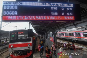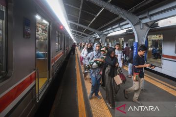 Penumpang kereta rel listrik (KRL) Commuterline Jabodetabek berjalan keluar dari gerbong usai tiba di Stasiun Jakarta Kota, Jakarta, Jumat (12/4/2024). Berdasarkan data yang dirilis PT Kereta Commuter Indonesia (KCI) pada Kamis (11/4/2024) pukul 15.00 WIB, jumlah penumpang KRL Commuterline Jabodetabek pada hari kedua Lebaran 2024 mencapai 339.022 orang atau naik 32 persen dibandingkan periode jam yang sama pada hari pertama Lebaran yang mencapai 250.599 orang. ANTARA FOTO/Aditya Pradana Putra/pras.