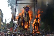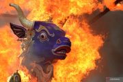 Prosesi pembakaran peti berbentuk lembu yang berisi jenazah Tjokorda Bagus Santaka saat upacara pelebon di Ubud, Gianyar, Bali, Minggu (14/4/2024). Ribuan warga serta wisatawan mengiringi dan menyaksikan upacara pelebon atau ngaben almarhum Tjokorda Bagus Santaka yang semasa hidupnya merupakan salah satu tokoh masyarakat khususnya dalam bidang adat di kawasan Ubud yang meninggal karena sakit pada 1 Februari 2024. ANTARA FOTO/Fikri Yusuf/foc.