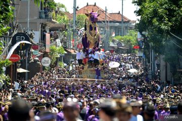 Ribuan warga mengarak peti berbentuk lembu saat upacara pelebon jenazah Tjokorda Bagus Santaka di Ubud, Gianyar, Bali, Minggu (14/4/2024). Ribuan warga serta wisatawan mengiringi dan menyaksikan upacara pelebon atau ngaben almarhum Tjokorda Bagus Santaka yang semasa hidupnya merupakan salah satu tokoh masyarakat khususnya dalam bidang adat di kawasan Ubud yang meninggal karena sakit pada 1 Februari 2024. ANTARA FOTO/Fikri Yusuf/foc.