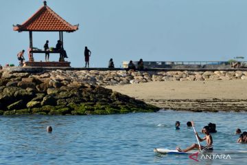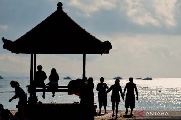 Wisatawan domestik berwisata di Pantai Sanur, Denpasar, Bali, Senin (15/4/2024). Hari terakhir masa libur dan cuti bersama Hari Raya Idul Fitri 2024 dimanfaatkan oleh masyarakat untuk berwisata ke berbagai destinasi yang ada di Pulau Dewata. ANTARA FOTO/Fikri Yusuf/aww.