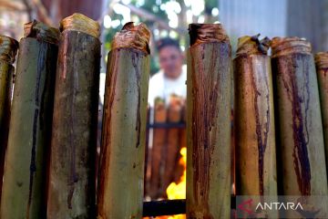 Seorang warga memasukkan beras ketan ke dalam bambu untuk dimasak menjadi nasi bulu atau lemang di Desa Huidu, Kabupaten Gorontalo, Gorontalo, Selasa (16/4/2024). Nasi bulu atau lemang merupakan kudapan khas warga Jawa Tondano pada Lebaran Ketupat yang dirayakan satu pekan setelah Idul Fitri. ANTARA FOTO/Adiwinata Solihin/aww.