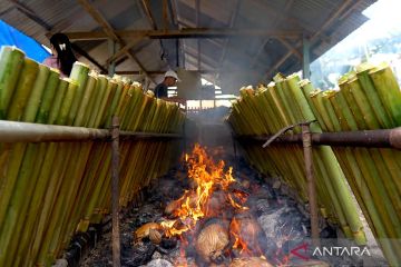 Seorang warga memasak nasi bulu atau lemang dengan menggunakan bara api sabut kelapa di Yosonegoro, Kabupaten Gorontalo, Gorontalo, Selasa (16/4/2024). Nasi bulu atau lemang merupakan kudapan khas warga Jawa Tondano pada Lebaran Ketupat yang dirayakan satu pekan setelah Idul Fitri. ANTARA FOTO/Adiwinata Solihin/aww.