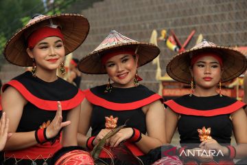 Sejumlah perempuan Suku Dayak berpose saat acara pembukaan Naik Dango ke-I di Rumah Radakng, Pontianak, Kalimantan Barat, Kamis (18/4/2024). Naik Dango digelar Dewan Adat Dayak Kota Pontianak untuk mengucapkan rasa syukur kepada Sang Pencipta atas hasil panen padi yang diperoleh selama berladang sekaligus melestarikan adat budaya peninggalan leluhur. ANTARA FOTO/Jessica Wuysang/rwa.