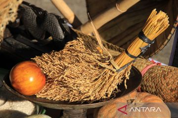 Beberapa ikat padi dan sayur-sayuran hasil panen dibawa warga Suku Dayak saat acara pembukaan Naik Dango ke-I di Rumah Radakng, Pontianak, Kalimantan Barat, Kamis (18/4/2024). Naik Dango digelar Dewan Adat Dayak Kota Pontianak untuk mengucapkan rasa syukur kepada Sang Pencipta atas hasil panen padi yang diperoleh selama berladang sekaligus melestarikan adat budaya peninggalan leluhur. ANTARA FOTO/Jessica Wuysang/rwa.