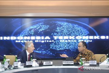 Menteri Komunikasi dan Informatika Budi Arie Setiadi (kanan) berbincang dengan Pendiri dari Organisasi Nirlaba Tony Blair Insitute, Tony Blair (kiri) saat berkunjung di Kantor Kementerian Kominfo, Jakarta, Jumat (19/4/2024). Kunjungan Tony Blair tersebut membahas isu-isu terkait transformasi digital Indonesia dengan tiga bahasan utama terkait pusat data, teknologi dan inovasi konektivitas, dan identitas digital atau Digital ID. ANTARA FOTO/M Risyal Hidayat/wpa.