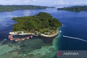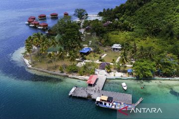 Foto udara objek wisata Pulau Nusa Ra di Pulau Bacan, Kabupaten Halmahera Selatan, Maluku Utara Sabtu (20/4/2024). Pemkab Halmahera Selatan pada 2023 mengembangkan Pulau Nusa Ra menggunakan dana APBD sebesar Rp6 miliar untuk membangun 7 unit vila terapung dan fasilitas penunjang lainnya guna meningkatkan kunjungan wisatawan domestik maupun mancanegara sehingga mendorong perekonomian masyarakat di pulau tersebut. ANTARA FOTO/Andri Saputra/rwa.
