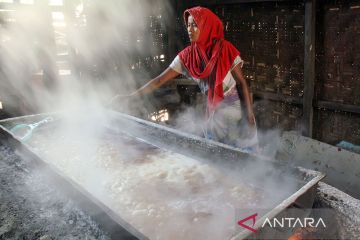 Petani garam tradisional memasak air laut untuk pembuatan garam di Desa Glumpang Sulu Timu, Dewantara, Aceh Utara, Aceh, Senin (22/4/2024). Badan Pertanahan Nasional (BPN) Aceh Utara melalui program Gerakan Sinerji Reforma Agraria memfasilitasi sertifikasi halal UMKM garam secara gratis dan Nomor Induk Berusaha (NIB) dalam rangka mendorong peningkatan pengembangan usaha tambak garam tradisional di Aceh Utara. ANTARA FOTO/Rahmad/rwa.