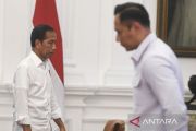 Presiden Joko Widodo (kiri) tiba untuk memimpin rapat terbatas tentang penanganan erupsi Gunung Ruang di Istana Merdeka, Jakarta, Jumat (3/5/2024). Presiden menginstruksikan Menteri ATR/Kepala BPN Agus Harimurti Yudhoyono untuk memastikan tanah yang menjadi tujuan relokasi penduduk terdampak erupsi Gunung Ruang siap dan tidak bermasalah. ANTARA FOTO/Muhammad Adimaja/rwa.