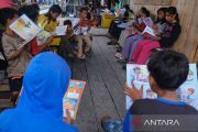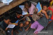 Sejumlah anak membaca buku saat mengikuti program sekolah berjalan di salah satu halaman rumah warga di Desa Bajo Mola, Kabupaten Wakatobi, Sulawesi Tenggara, Jumat (3/5/2024). Program yang berjalan selama 2 tahun itu telah mendidik sekitar 50 orang anak Suku Bajo agar memiliki kemampuan menulis dan membaca. ANTARA FOTO/Andry Denisah/rwa.