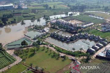 Foto udara kawasan wisata DâSawah di Bogor, Jawa Barat, Sabtu (4/5/2024). Menurut Kementerian Pariwisata dan Ekonomi Kreatif, tren pariwisata 2024 akan mendorong wisatawan untuk mencari pengalaman baru, dan meninggalkan konsep berwisata yang konvensional. ANTARA FOTO/Yulius Satria Wijaya/Spt.