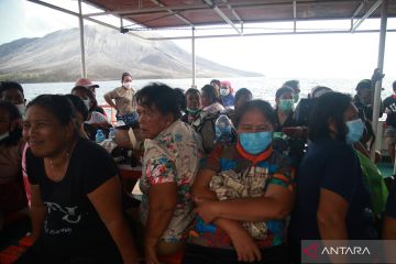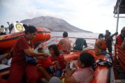 Sejumlah warga yang akan mengungsi ke Minahasa Utara berada di atas KN SAR Bima Sena di Tagulandang, Kabupaten Kepulauan Sitaro, Sulawesi Utara, Sabtu (4/5/2024). Badan Nasional Penanggulangan Bencana (BNPB) mengatakan warga yang diungsikan dari Pulau Tagulandang tersebut mencapai 6.125 jiwa yang dievakuasi melalui jalur laut ke beberapa daerah yakni Siau, Likupang, Bitung dan Manado menyusul aktivitas Gunung Ruang masih tinggi dan berstatus awas. ANTARA FOTO/Andri Saputra/aww.
