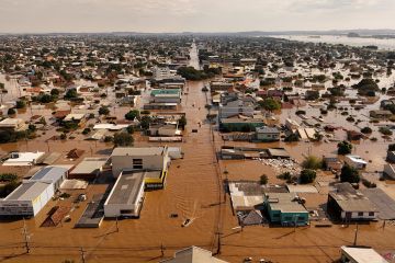 Foto udara situasi banjir di kawasan Mathias Velho, Canoas, Rio Grande do Sul, Brazil, Minggu (5/5/2024). Banjir di Brazil menewaskan lebih dari 70 warga sementara lebih dari 100 lainnya dilaporkan hilang. ANTARA FOTO/REUTERS/Amanda Perobelli/foc.