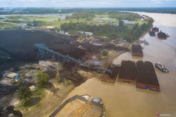 Foto udara aktivitas tempat penampungan sementara batu bara di tepi Sungai Batanghari, Muaro Jambi, Jambi, Senin (6/5/2024). Badan Pusat Statistik Provinsi Jambi mencatat, nilai ekspor batu bara daerah itu periode Januari sampai Maret 2024 hanya mencapai 36,84 juta dolar AS atau anjlok sebesar 73,21 persen dibanding periode yang sama pada tahun sebelumnya yang mencapai 137,51 dolar AS. ANTARA FOTO/Wahdi Septiawan/foc.