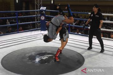 Atlet junior MMA Flora N. Girsang (tengah) membanting lawannya atlet Vanesta Risky Aprilia (kiri) pada babak final kategori U-18 Girls 52,2 Kg dalam Kejuaraan Nasional MMA U-18 Piala Pertacami 1 Jakarta 2024 di Jakarta, Sabtu (11/5/2024). Kejuaraan itu menjadi wadah bagi para atlet junior untuk mengasah kemampuannya dan mencari talenta terbaik Indonesia dalam rangka menghadapi Kejuaraan Dunia Global Association Mixed Martial Arts (MMA) World Championship 2024, dimana Indonesia akan menjadi tuan rumah pada 6 - 15 Desember 2024. ANTARA FOTO/Indrianto Eko Suwarso/YU