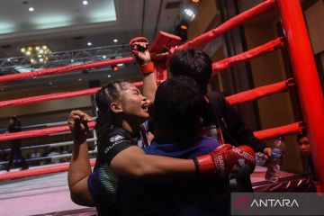 Atlet junior MMA Flora N. Girsang meluapkan kegembiraannya usai bertanding melawan atlet Vanesta Risky Aprilia pada babak final kategori U-18 Girls 52,2 Kg dalam Kejuaraan Nasional MMA U-18 Piala Pertacami 1 Jakarta 2024 di Jakarta, Sabtu (11/5/2024). Kejuaraan itu menjadi wadah bagi para atlet junior untuk mengasah kemampuannya dan mencari talenta terbaik Indonesia dalam rangka menghadapi Kejuaraan Dunia Global Association Mixed Martial Arts (MMA) World Championship 2024, dimana Indonesia akan menjadi tuan rumah pada 6 - 15 Desember 2024. ANTARA FOTO/Indrianto Eko Suwarso/YU