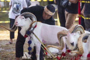 Juri memberi penilaian pada seekor domba dalam acara Pameran dan Kontes Domba yang digelar Dinas Ketahanan Pangan dan Pertanian Kabupaten Indramayu di Sport Center, Indramayu, Jawa Barat, Minggu (12/5/2024). Kegiatan yang diikuti sekitar 400 peternak domba se Jawa Barat itu untuk mengapresiasi peternak sekaligus untuk mengoptimalkan hasil dan penjualan peternakan. ANTARA FOTO/Dedhez Anggara/foc.