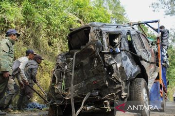 Petugas mengevakuasi mobil dengan nomor polisi B 1683 TJG yang terjun ke jurang di Desa Ngadas, Kecamatan Poncokusumo, Kabupaten Malang, Jawa Timur, Selasa (14/5/2024). Kecelakaan tunggal yang terjadi di jalur kawasan Taman Nasional Bromo Tengger Semeru (TNBTS) pada Senin (13/5) malam tersebut menyebabkan empat orang meninggal dunia dan lima lainnya luka-luka. ANTARA FOTO/Irfan Sumanjaya/spt.