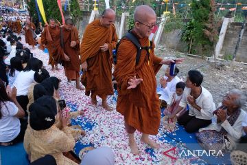 Warga menyambut kedatangan Bhikkhu Thudong di Kalimanggis, Kaloran, Temanggung, Jawa Tengah, Jumat (17/5/2024). Para Bhikkhu Thudong tersebut rencananya akan melakukan kegiatan keagamaan di wilayah Kabupaten Temanggung sebelum melanjutkan perjalanan menuju Candi Borobudur. ANTARA FOTO/Anis Efizudin/Spt.