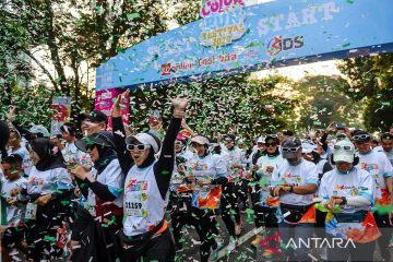 Peserta mengikuti "Color Run Festival" di Jalan Diponegoro, Bandung, Jawa Barat, Minggu (19/5/2024). Ajang lari santai sepanjang 5 kilometer yang diikuti 6.000 peserta dan diselingi dengan tabur bubuk warna-warni di beberapa titik tersebut bertujuan untuk mengkampanyekan perilaku hidup sehat salah satunya dengan olahraga lari. ANTARA FOTO/Raisan Al Farisi/Spt.