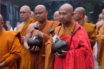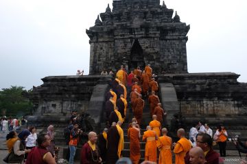 Sejumlah Bhikkhu melakukan Pradaksina dengan berjalan mengelilingi candi saat prosesi penyematan Air Suci di Candi Mendut, Magelang, Jawa Tengah, Rabu (22/5/2024). Air Suci diambil dari mata air umbul Jumprit Temanggung tersebut selanjutnya akan dibawa ke Candi Borobudur bersama Api Dharma pada puncak perayaan Hari Raya Tri Suci Waisak 2568 BE/2024. ANTARA FOTO/Anis Efizudin/foc.
