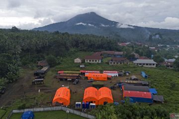 Foto udara suasana posko pengungsian di Desa Gam Ici, Kabupaten Halmahera Barat, Maluku Utara, Jumat (31/5/2024). Pemerintah Kabupaten Halmahera Barat menetapkan masa tanggap darurat bencana erupsi Gunung Ibu diperpanjang 14 hari ke depan dengan memfokuskan penanganan pengungsi yang terdampak karena aktivitas Gunung Ibu masih berstatus level IV (Awas) sehingga masyarakat diimbau agar tidak beraktivitas di radius 4 kilometer dan  perluasan sektoral berjarak 7 kilometer dari arah utara bukaan kawah. ANTARA FOTO/Andri Saputra/foc.
