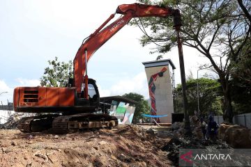 Pekerja menggunakan alat berat untuk menyelesaikan pembangunan arena (venue) Pekan Olahraga Nasional (PON) XXI Aceh-Sumut cabor panjat tebing di komplek Stadion Harapan Bangsa, Banda Aceh, Aceh, Kamis (6/6/2024). Penyelenggara PON XXI Aceh-Sumut optimistis mampu menyelesaikan 33 venue cabang olahraga di provinsi Aceh pada awal September mendatang dengan progres pembangunan arena tanding antara 40 hingga 60 persen lebih. ANTARA FOTO/Irwansyah Putra/nym.