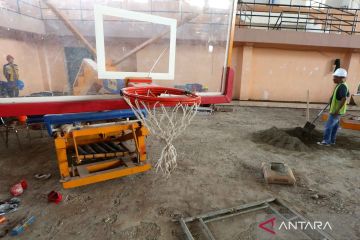 Pekerja menyelesaikan pembangunan arena (venue) Pekan Olahraga Nasional (PON) XXI Aceh-Sumut cabor basket di komplek Stadion Harapan Bangsa, Banda Aceh, Aceh, Kamis (6/6/2024). Penyelenggara PON XXI Aceh-Sumut optimistis mampu menyelesaikan 33 venue cabang olahraga di provinsi Aceh pada awal September mendatang dengan progres pembangunan arena tanding antara 40 hingga 60 persen lebih. ANTARA FOTO/Irwansyah Putra/nym.