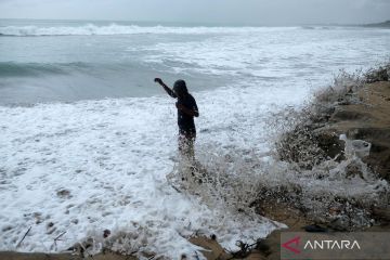 Seorang warga diterjang gelombang tinggi di Pantai Kuta, Badung, Bali, Jumat (7/6/2024). Balai Besar Meteorologi Klimatologi dan Geofisika Wilayah III Denpasar mengeluarkan peringatan dini per Sabtu (8/6) untuk mewaspadai potensi hujan yang dapat disertai kilat/petir dan tinggi gelombang laut mencapai dua meter atau lebih di Selat Bali bagian selatan, Selat Badung, Selat Lombok bagian Selatan, Perairan Selatan Bali, dan Samudera Hindia Selatan Bali. ANTARA FOTO/Nyoman Hendra Wibowo/aww.