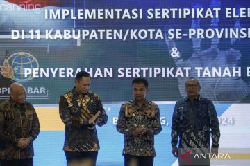 Menteri ATR/BPN Agus Harimurti Yudhoyono (kedua kiri) didampingi Sekjend ATR/BPN Suyus Windayana (kanan), Pj Gubernur Jawa Barat Bey Machmuddin (kedua kanan) dan Kepala BPN Jawa Barat Yuniar Hikmat (kiri) melakukan peluncuran dan penyerahan implementasi sertifikat elektronik di Gedung Sate, Bandung, Jawa Barat, Minggu (9/6/2024). Kementerian ATR/BPN meluncurkan implementasi sertifikat elektronik di 11 kabupaten/kota se-Jawa barat sekaligus menyerahkan 136 sertifikat elektronik aset pemerintah, pemerintah daerah, barang milik negara, dan perorangan di wilayah Jawa Barat. ANTARA FOTO/Novrian Arbi/YU