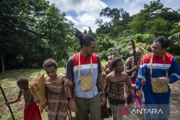 Dua pekerja Pertamina EP Papua Field disambut warga suku Moi di Kampung Malasigi, Distrik Klayili, Kabupaten Sorong, Papua Barat Daya, Rabu (12/6/2024). Pertamina EP Papua Field yang bekerja sama dengan Pemprov Papua Barat daya, Pemda Kabupaten Sorong, Balai Perhutanan Sosial dan Kemitraan Lingkungan (BPSKL) Maluku Papua, Balai Besar Konservasi Sumber Daya Alam (BBKSDA) Papua Barat, Yayasan Kasuari Tanah Papua dan Himpunan Pramuwisata Indonesia (HPI) Papua Barat Daya memberikan pendampingan wisata minat khusus yang menawarkan keanekaragam hayati, sumber daya alam hutan dan budaya. ANTARA FOTO/Erlangga Bregas Prakoso/Spt.