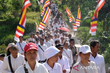 Umat Buddha mengikuti kirab Gebyar Waisak 2568 BE/ 2024 di Krecek, Getas, Kaloran, Temanggung, Jateng, Minggu (16/6/2024). Gebyar Waisak 2024 mengusung tema Memperkokoh Persatuan dalam Keberagaman itu dihadiri ribuan umat Buddha dari berbagai daerah yang diisi dengan sejumlah kegiatan seperti pentas seni dan kegiatan keagamaan. ANTARA FOTO/Anis Efizudin/Spt.