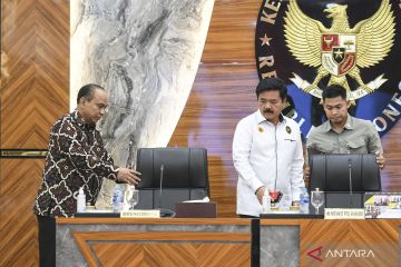 Menko Polhukam Hadi Tjahjanto (kanan) berbincang dengan Menkominfo Budi Ari Setiadi saat memimpin Rapat Koordinasi Tingkat Menteri tentang pemberantasan judi online di Kemenko Polhukam, Jakarta, Rabu (19/6/2024). Rapat perdana Satgas Pemberantasan Judi Online itu digelar setelah dibentuknya satgas tersebut oleh Presiden Joko Widodo pada 14 Juni 2024 dalam upaya percepatan pemberantasan judi online secara tegas dan terpadu. ANTARA FOTO/Hafidz Mubarak A/aww.