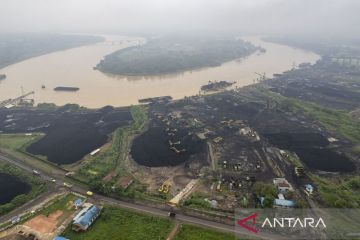 Foto udara aktivitas tempat penampungan batu bara di tepi Sungai Batanghari, Muaro Jambi, Jambi, Kamis (20/6/2024). Badan Pusat Statistik (BPS) mencatat nilai ekspor batu bara Indonesia pada Mei 2024 sebesar 2,5 miliar dolar AS, turun 4,04 persen dibanding bulan sebelumnya atau turun sebesar 16,85 persen dibanding Mei tahun lalu. ANTARA FOTO/Wahdi Septiawan/tom.