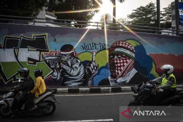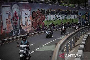 Sejumlah kendaraan melintas di dekat mural bertema dukungan untuk Palestina di kawasan Dukuh Atas, Jakarta, Jumat (21/6/2024). Komunitas Berkemas membuat mural tersebut sebagai bentuk solidaritas dan dukungan kepada warga Palestina atas serangan pasukan Israel ke Kota Rafah. ANTARA FOTO/Aprillio Akbar/rwa.