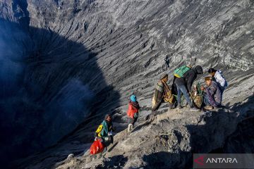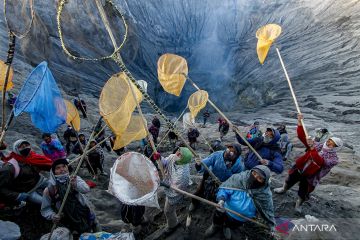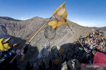Masyarakat Suku Tengger merayakan Yadnya Kasada di kawah Gunung Bromo, Probolinggo, Jawa Timur, Sabtu (22/6/2024). Perayaan Yadnya Kasada merupakan bentuk ungkapan syukur dan penghormatan kepada leluhur masyarakat Suku Tengger dengan cara melarung sesaji berupa hasil bumi dan ternak ke kawah Gunung Bromo. ANTARA FOTO/Muhammad Mada/aww.
