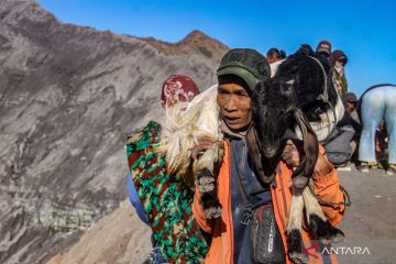 Warga membawa kambing yang merupakan persembahan masyarakat Suku Tengger di kawah Gunung Bromo, Probolinggo, Jawa Timur, Sabtu (22/6/2024). Perayaan Yadnya Kasada merupakan bentuk ungkapan syukur dan penghormatan kepada leluhur masyarakat Suku Tengger dengan cara melarung sesaji berupa hasil bumi dan ternak ke kawah Gunung Bromo. ANTARA FOTO/Muhammad Mada/aww.
