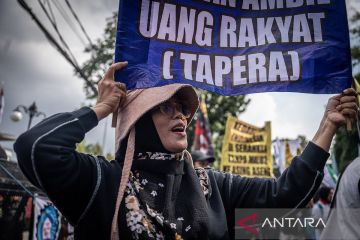 Seorang buruh mengangkat poster aksi saat unjuk rasa menolak program Tapera di depan Kantor Kementerian Keuangan, Jakarta, Kamis (27/6/2024). Dalam aksi yang dilakukan oleh Aliansi Aksi Sejuta Buruh, Kongres Aliansi Serikat Buruh (KASBI) dan Serikat Pekerja Seluruh Indoneisa (SPSI) tersebut mendesak pemerintah membatalkan program Tabungan Perumahan Rakyat (Tapera). ANTARA FOTO/Bayu Pratama S/rwa.