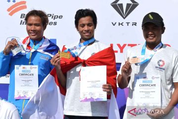 Perenang Indonesia Aflah Fadlan Prawira (tengah) berfoto dengan perenang asal Thailand Suabsakul Kumton (kiri) dan perenang Indonesia Dimas Permana Taufik (kanan) saat penyerahan medali pemenang 2nd Southeast Asia Open Water Swimming Championships 2024 di Jimbaran, Badung, Bali, Sabtu (29/6/2024). Aflah Fadlan Prawira berhasil menjuarai nomor 10 kilometer putra kategori usia 20 tahun ke atas dengan catatan waktu 2 jam 5 menit 23 detik disusul Suabsakul Kumton dengan waktu 2 jam 7 menit 2 detik dan Dimas Permana Taufik dengan waktu 2 jam 14 menit 16 detik. ANTARA FOTO/Fikri Yusuf/YU