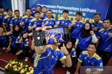 Sejumlah atlet gulat Jawa Barat berswafoto saat acara pelepasan untuk pemusatan latihan ke Korea Selatan di Gedung Sate, Bandung, Jawa Barat, Jumat (5/7/2024). Sebanyak 145 atlet dan pelatih Jawa Barat dari berbagai cabang olahraga antara lain taekwondo, gulat, panahan hingga tinju akan melakukan pemusatan latihan di Korea Selatan untuk persiapan PON XXI Aceh-Sumatera Utara yang ditargetkan mampu meraih 24 medali emas. ANTARA FOTO/Novrian Arbi/YU
