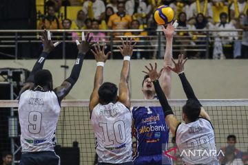 Pevoli putra Jakarta Lavani Allow Bank Electric Renan Zanatta Buiatti (kedua kanan) melakukan smes ke arah pevoli Jakarta Bhayangkara Presisi Noumory Keita (kiri), RD Ahmad Gumilar (tengah), dan Nizar Zulfikar (kanan) pada pertandingan minggu kedua Final Four PLN Mobile Proliga 2024 di GOR Jatidiri, Semarang, Jawa Tengah, Jumat (12/7/2024). Jakarta Lavani Allo Bank mengalahkan Jakarta Bhayangkara Presisi dengan skor 3-0 (25-23, 25-22, 25-16). ANTARA FOTO/Makna Zaezar/tom.